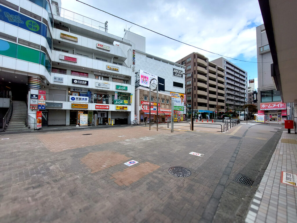 明大前駅の駅前広場。そこそこ広いスペースの奥にはテナントビル「レインボービル」があり、人気ラーメン店やケンタッキーフライドチキン、お食事処、カラオケ店、スマホショップなどたくさんの店舗が営業。華やかとはいえないまでも、どこか懐かしいにぎわいを形成しています。