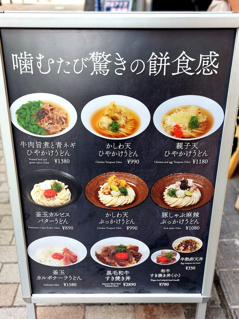 看板メニューは〈釜玉明太カルピスバターうどん〉で、ほかにも〈豚しゃぶ麻辣ひやかけ〉や〈釜玉黒トリュフバターうどん〉など、個性あるうどんを数多くラインナップ。