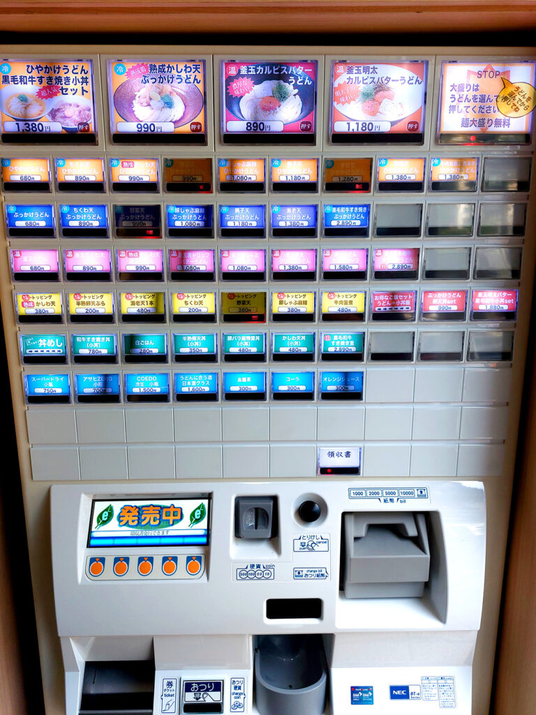 店頭の券売機で食券を購入する先払いシステム。支払方法は今のところ現金のみで、キャッシュレスは利用できません。