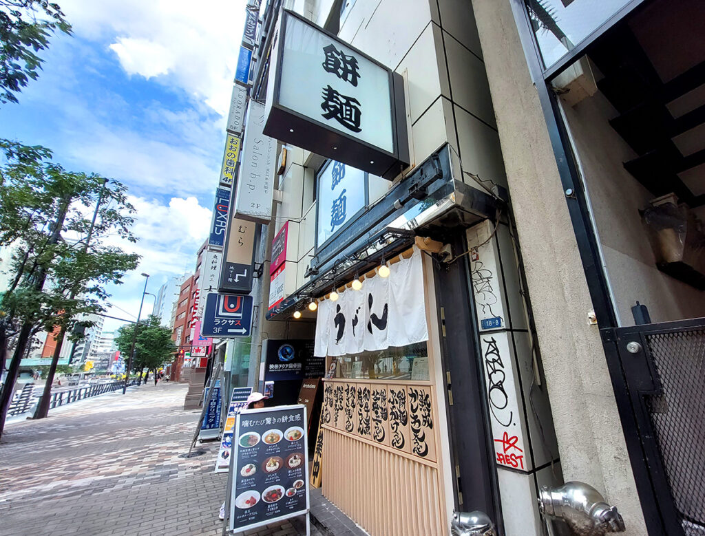 大きな「餅麺」の看板と白い暖簾が目印です。