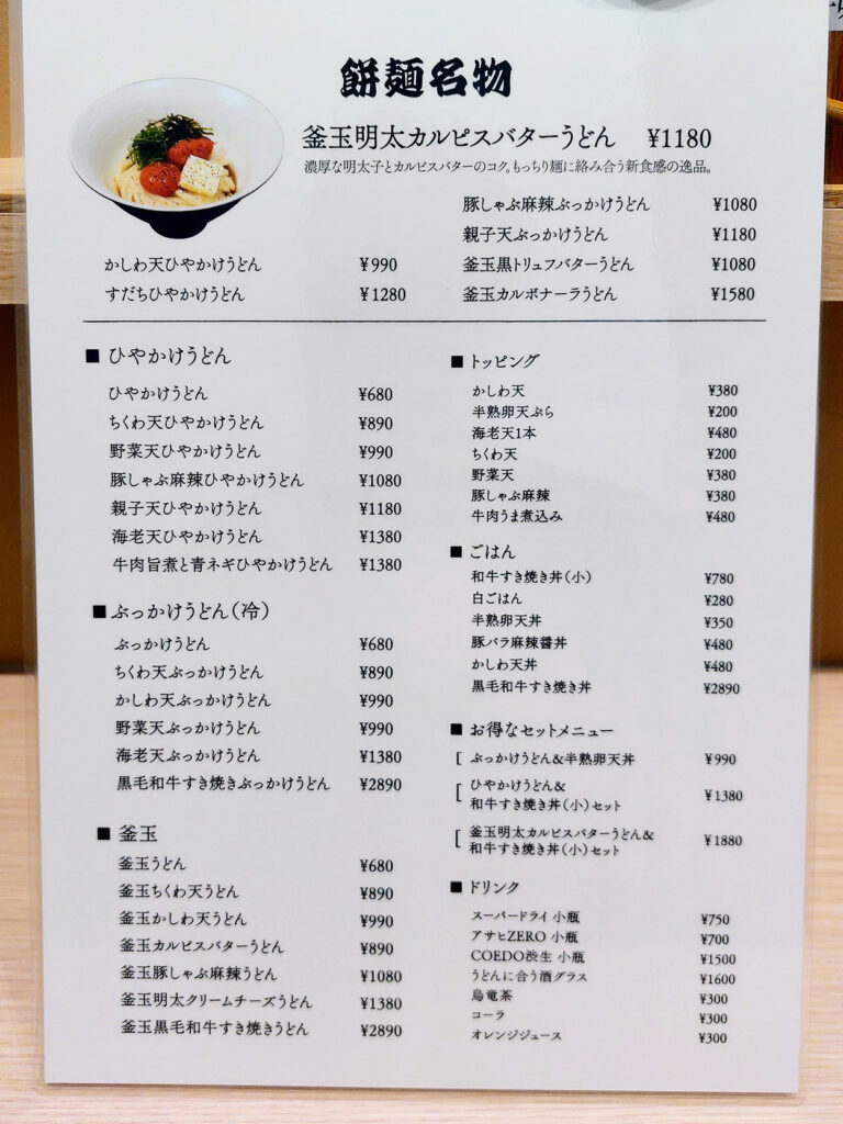 種類は釜玉10種、ひやかけ9種、ぶっかけ8種と幅広く、価格帯は1000円前後を中心に680円〜2890円で提供。かしわ天や豚しゃぶ麻辣などのトッピング、和牛すき焼き丼や半熟卵天丼などのごはんもの、お得なうどんとごはんもののセット、アルコールやソフトドリンクも用意しています。