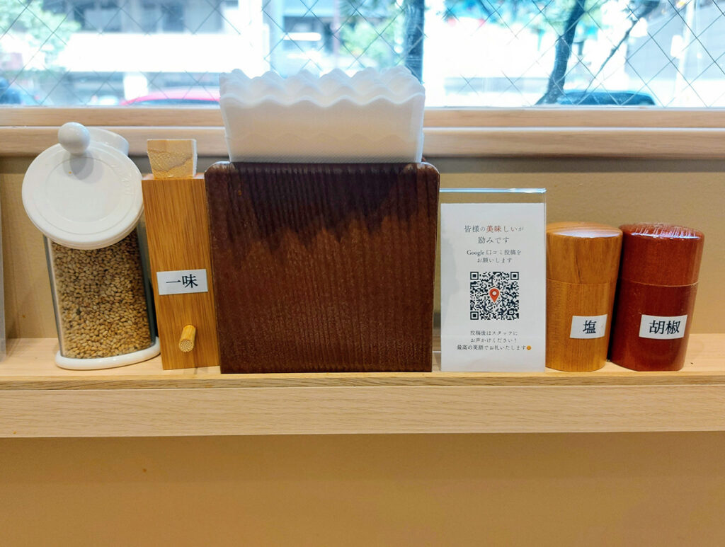 テーブル調味料は胡麻、一味、塩、胡椒。