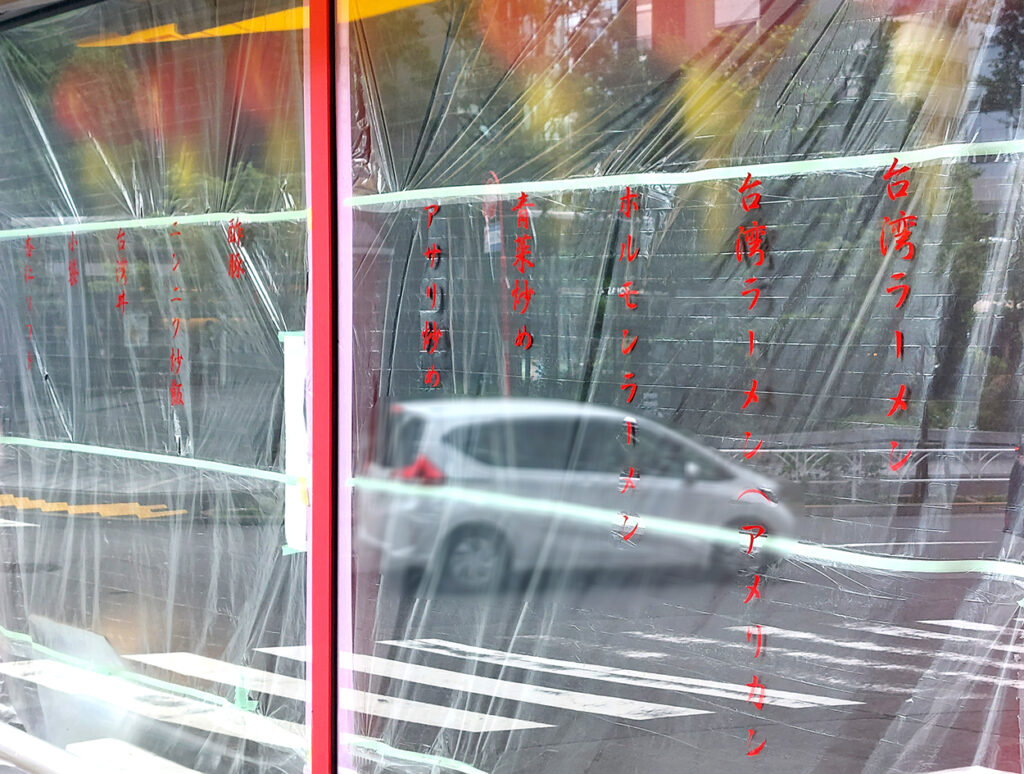 窓ガラスには赤文字でメニューの一部も記載。人気の台湾ラーメン、辛さを抑えた台湾ラーメンアメリカン、ホルモンラーメン、青菜炒め、アサリ炒め、酢豚、ニンニク炒飯、台湾丼、小袋、杏仁ソフト…名古屋でも人気のお品書きばかり!もちろんメニューの一部かと思われますが、字面を見ただけでもお腹が空いてきます。