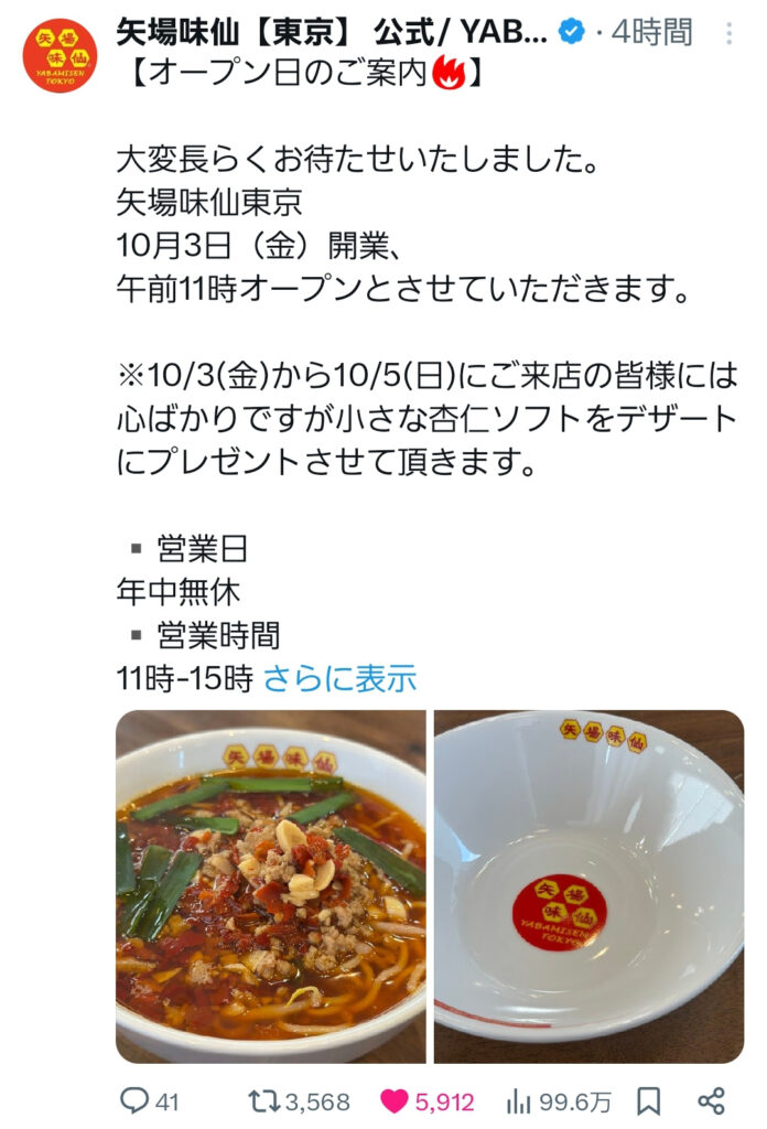 渋谷駅(井の頭線・JR東ほか)徒歩約5分の場所に2025年10月3日(金)、名古屋で人気の台湾料理店「矢場味仙(やばみせん)東京」がオープン予定です。名古屋名物 台湾ラーメン発祥・味仙の直系「矢場味仙」が、渋谷道玄坂で東京進出を果たします。