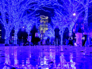 ケヤキ並木一帯は青一色の世界に。ここまで辺りが青いのは、並木通りの中央に光や風景が反射するシートを敷いているからなんですね。スマホやカメラをシートにギリギリまで近づけて、リフレクション(写り込み)撮影を楽しんでいる人も多くいました。