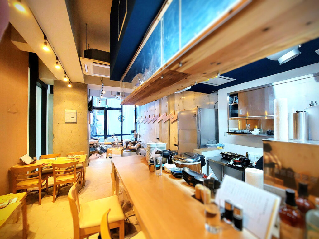 店内は、コンクリート打ちっぱなしと白木調を組み合わせたシンプル和モダンな佇まい。奥行きのある空間には、カウンター10席ほど、テーブル席36席ほどを設置しています。