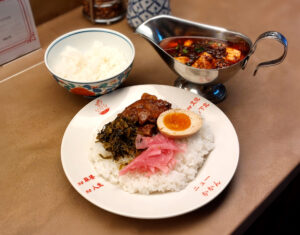 待つこと5分ほどでミックスが到着。カレー用ソースポットで提供される真っ赤な麻婆豆腐が…美味しそう!豚肉・高菜・玉ねぎピクルスを乗っけたルローライスもそそるビジュアルです。大盛り分のごはん(+100g)はお茶碗で別盛り提供。