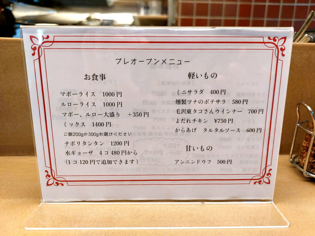 ニューかかんのメニューは、看板のマボーライス(麻婆豆腐)とルローライス(魯肉飯)をメインに、水ギョーザ、ナポリタンタンも用意。