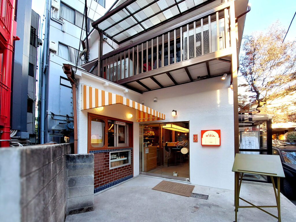ニューかかんは一軒家の古民家をリフォームした造り。1階は白い壁と赤いタイル、明るい木目を基調としたノスタルジックでかわいい佇まいです。