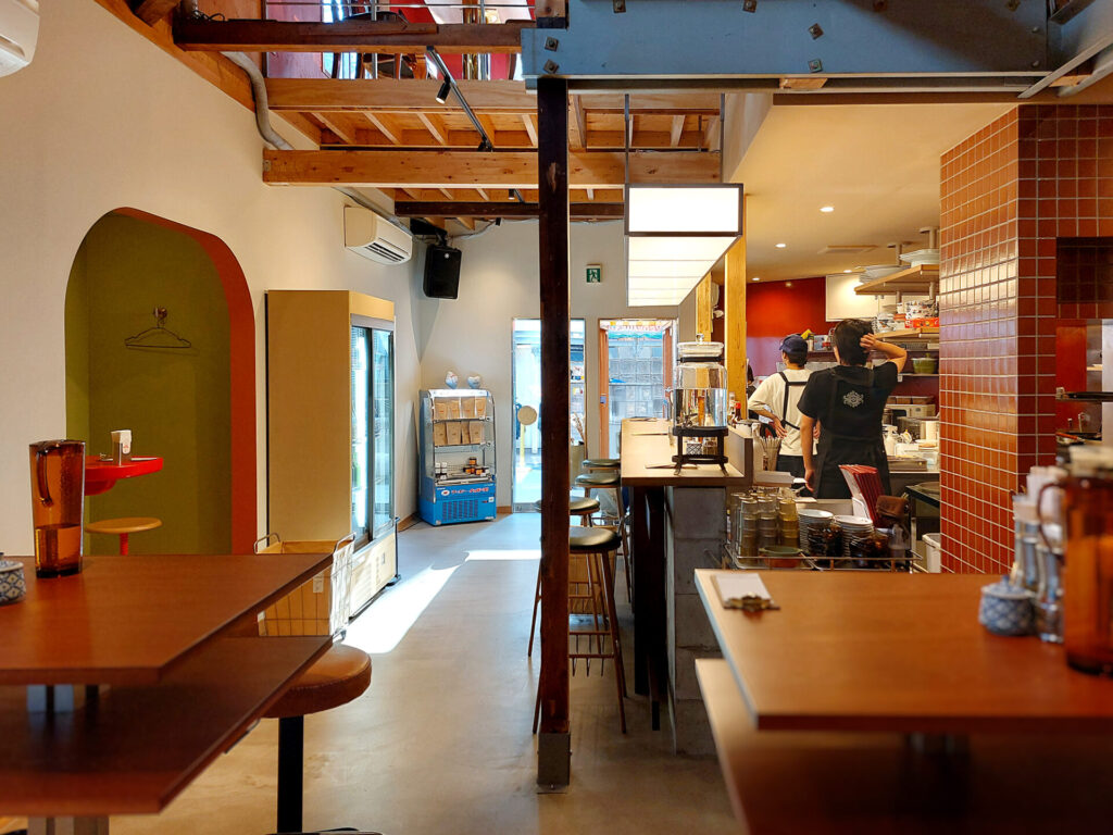 吹き抜け越しに1階を見下ろす構造も相まって空間演出としてもユニーク。席数はおよそ30席。テーブル席に加えてカウンター席も6席ほどを設置。ひとりでもグループでもゆったり食事が楽しめる雰囲気です。