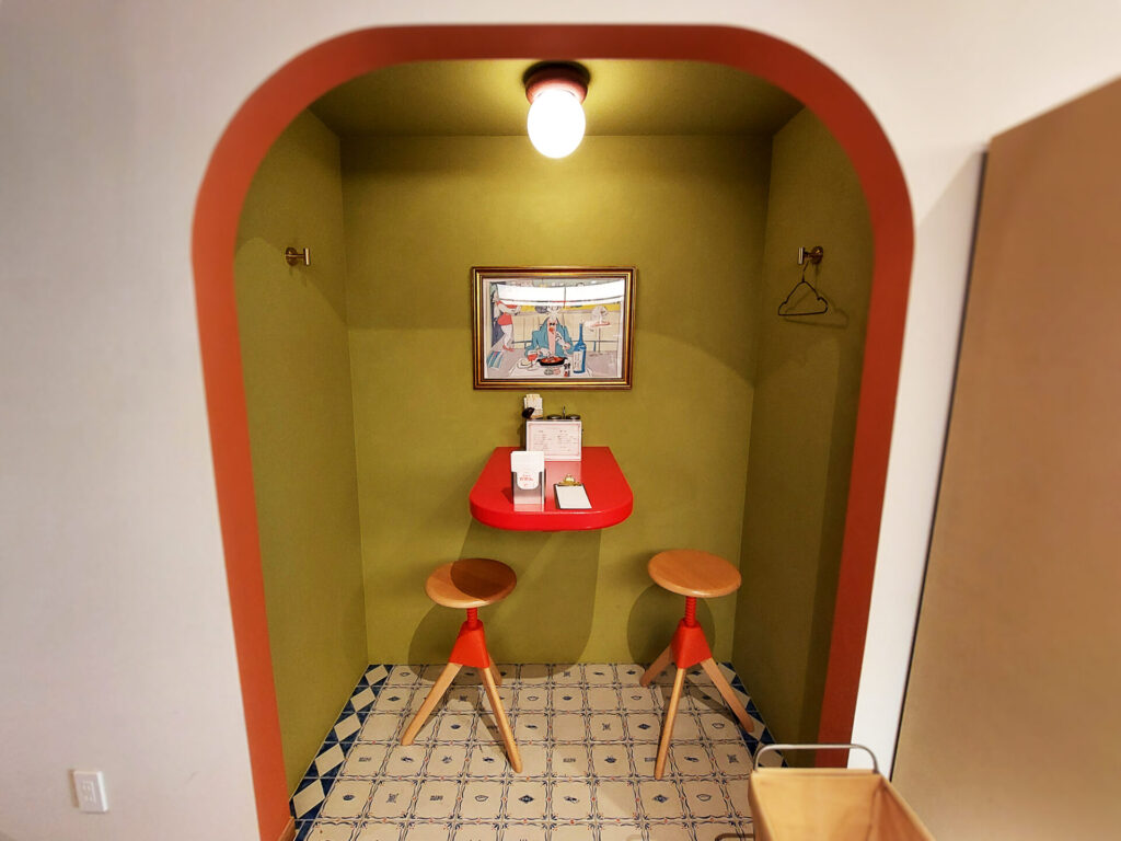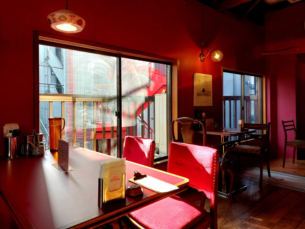 2階はガラッと印象が変わって、赤い壁とインテリアが映えるレトロ喫茶のような空間!