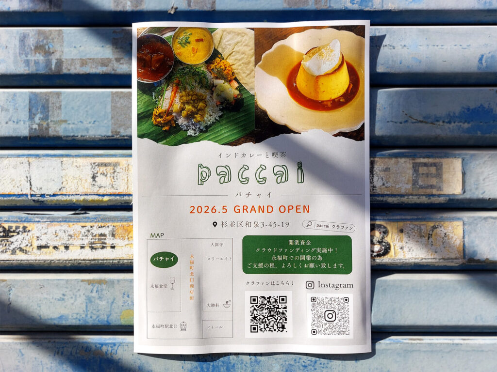 井の頭線・永福町駅徒歩約8分の永福町北口商店街に2026年5月、インドカレーと喫茶の店「paccai(パチャイ)」がオープン予定です。全国のイベントや間借り営業で多くの支持を集めたインドカレーの人気店「Nadi(ナディ)」が、店名改めpaccai(パチャイ)として実店舗を準備中です。