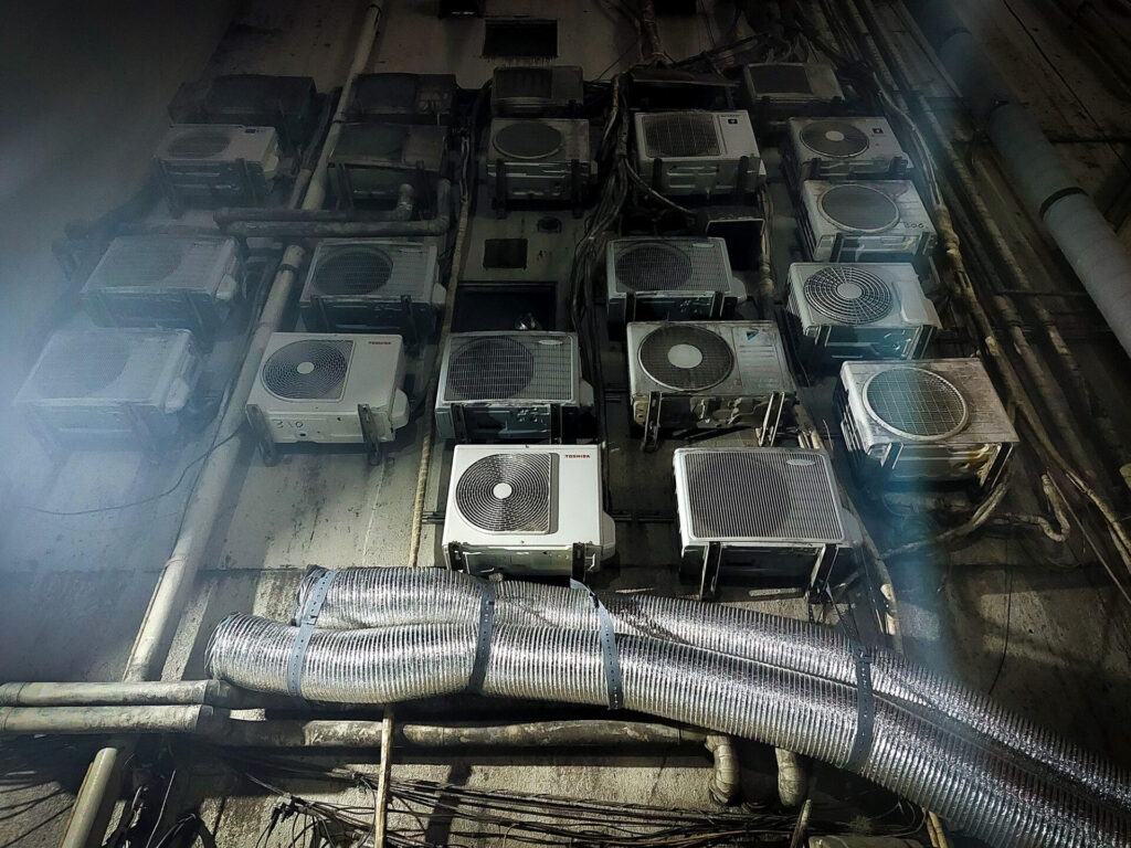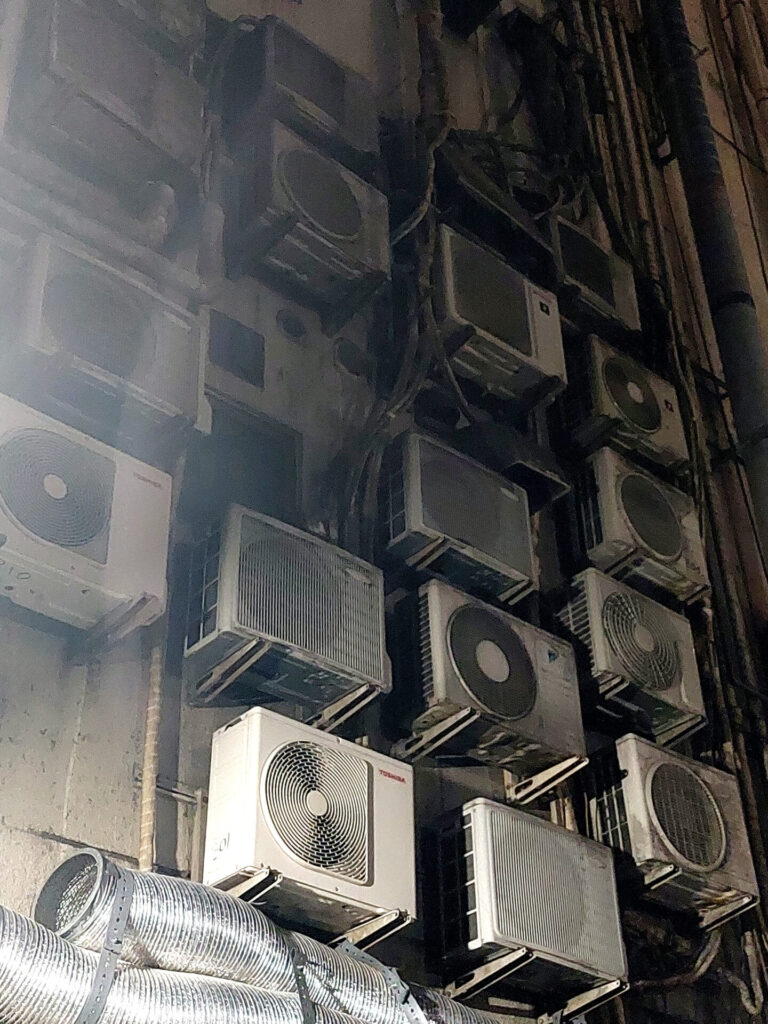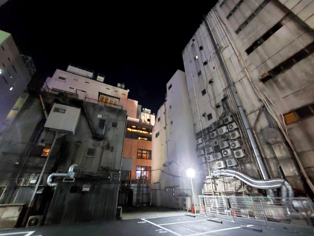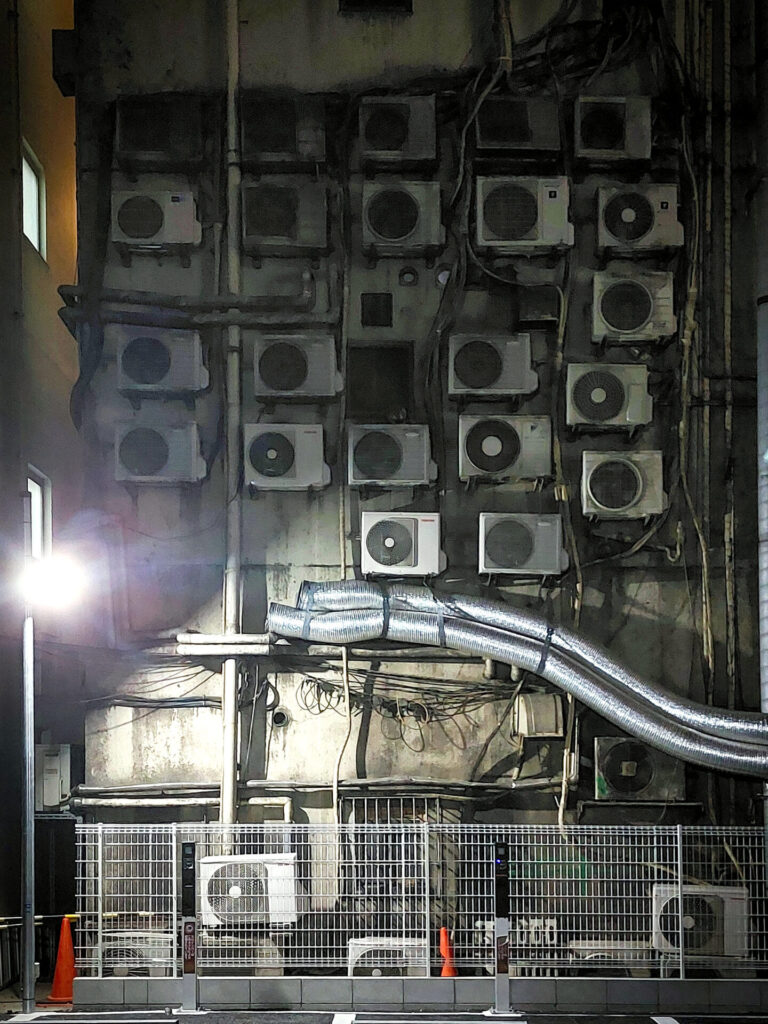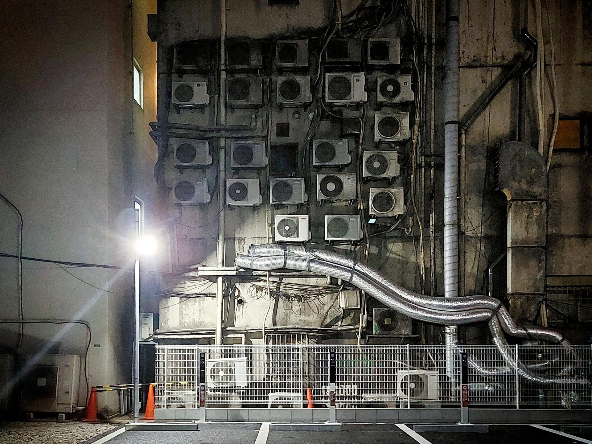 ビルの外壁に設置された大量のダクトと有機的なカーブを描く太い配管。街頭に照らされ夜にうっすら浮かび上がる光景は、インダストリアルな無機質美のなかに生命すら感じられます。