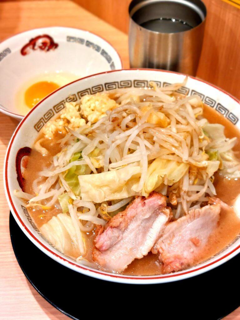 トッピングの生玉子を投入して全体をまろやかに。ペッパーや唐辛子でちょい味変をして最後まで飽きずに完食です!脳汁開放の満足感とともに丼をカウンター上に置いて颯爽と退店。また2週間後くらいに食べたくなりそう…!