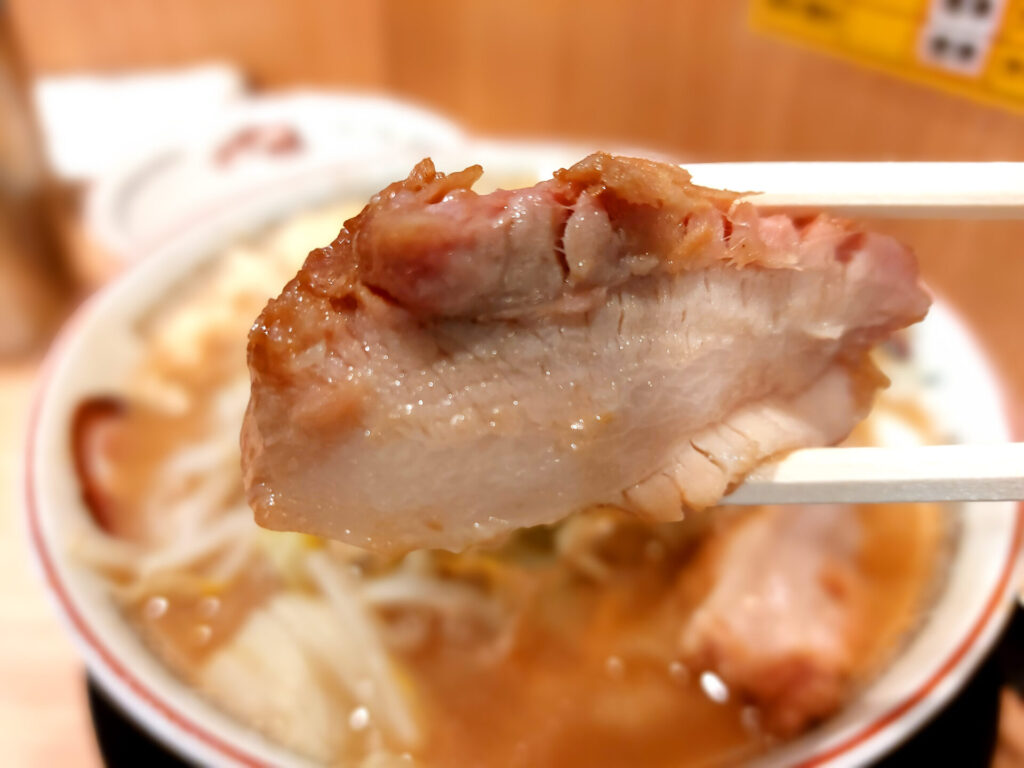 待つこと約4分で着丼(早い!)。厚切り豚肉と山盛りもやし&キャベツ、ニンニクを豪快に盛り付けたそそるビジュアル〜。