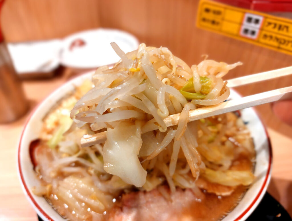 たっぷりのもやしとキャベツはシャキシャキ感が心地よく、キャベツの甘みがスープの塩っぱみとほどよいバランス。