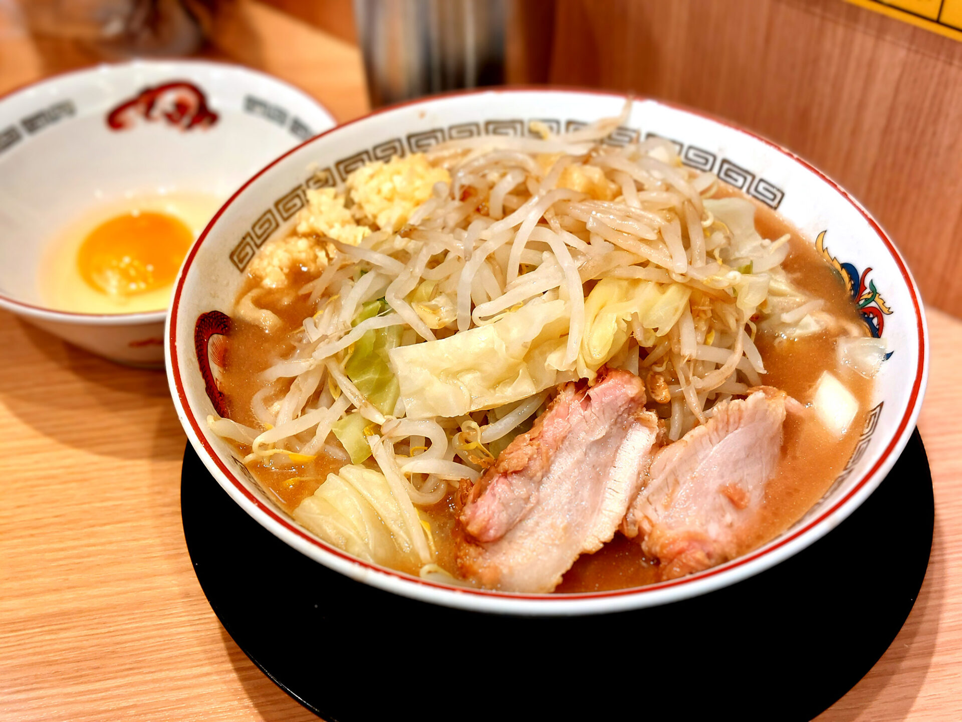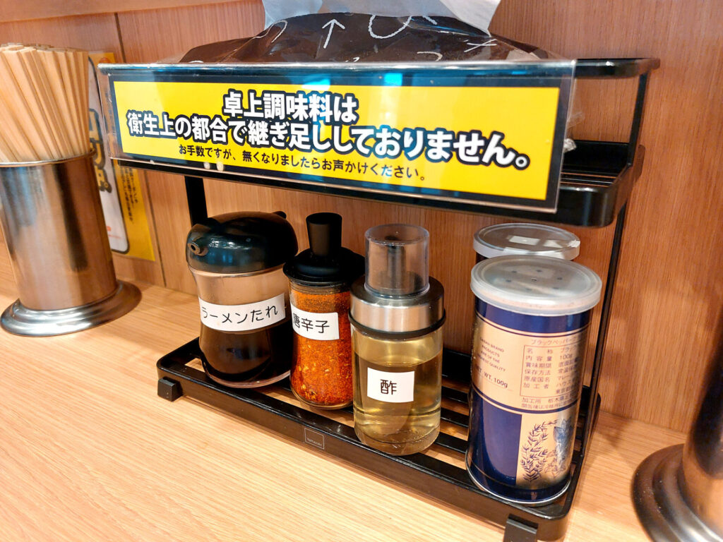 卓上調味料は、ラーメンのタレ、唐辛子、酢、ペッパーを用意。そして今回は小ラーメン(1000円)と生玉子(50円)をオーダー。コールは「ニンニク・野菜・カラメ」です。