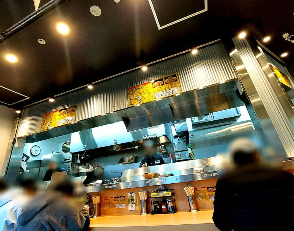 店内は木目と白、シルバーを基調としたモダンな佇まいで、壁面はガラス張りの明るく綺麗な空間。二郎系ラーメン店のイメージと違って閉塞感を感じさせない内装です。