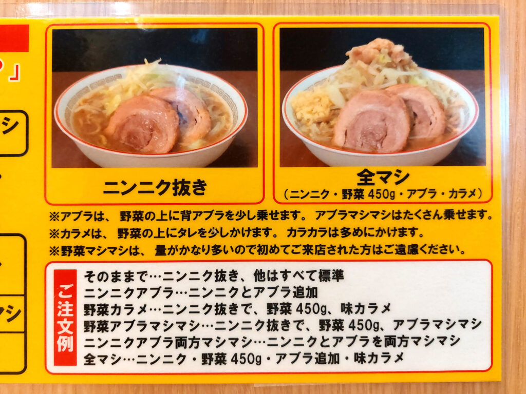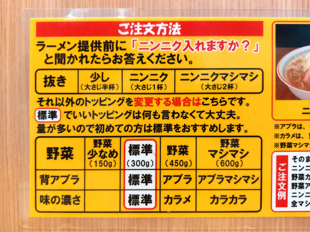よくある間違いは、「ニンニク入れますか?」と聞かれて、ニンニクの量だけ答えてしまうケース。野菜の量、脂の量、味の濃さの希望がある場合もこのタイミングでコールします。
