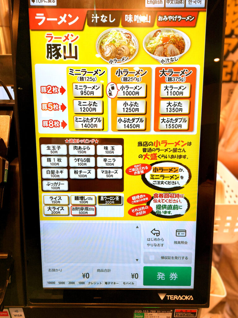 豚山 渋谷サクラステージ店の注文方法は、入店時にタッチパネル食券機で食券を購入するシステムです。