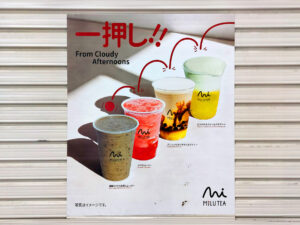 MILUTEAは、「晴れた朝から、曇りの午後まで。一杯に込めた、温もりと喜び。」をコンセプトに掲げるドリンクスタンド。店頭に掲出されたポスターによるとタピオカミルクティーやスムージーを中心に展開する模様。