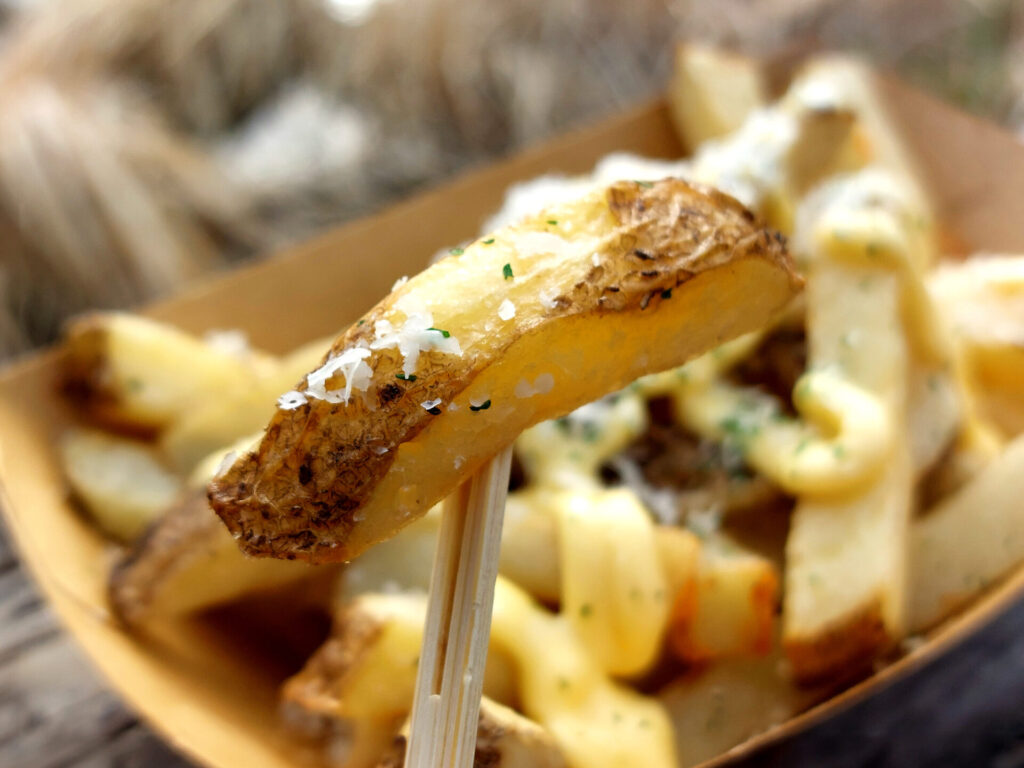 厳選直送の北海道産じゃがいもは、注文を受けてからカットすることで香りと風味が豊かに。さらに、温度の異なる油で二度揚げすることで、外はカリカリ・中はホクホクの食感に仕上げています。